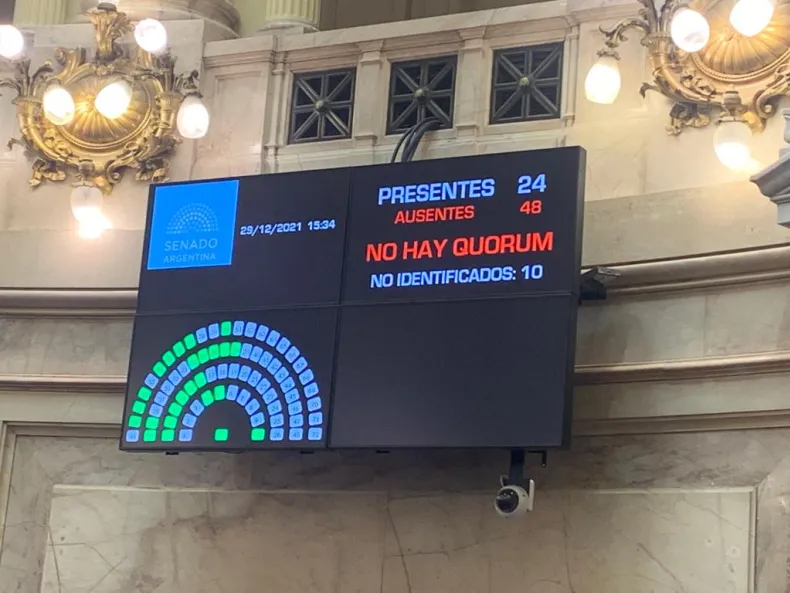 Sin embargo, la polémica se desató fuera del recinto. Para Juntos por el Cambio, la sesión fue nula porque el horario de convocatoria fue a las 15. Se esperó media hora, como lo marca el artículo 15 de la reglamentación de la Cámara Alta. Faltaba el oficialista Guillermo Andrada. El senador por Catamarca dio positivo al testeo de covid-19.