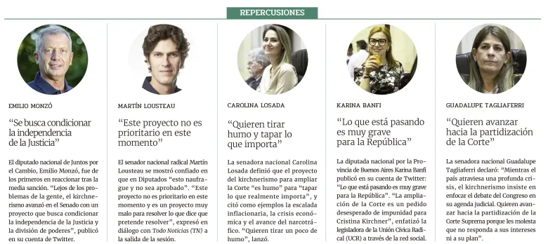 Por su parte, la senadora Juliana Di Tullio dijo que "esta Corte tiene que ser ampliada porque tiene que ser autocontrolada y porque es la única manera que sea más democrática, que sea independiente en serio y que sea federal". "Nosotros creemos que ampliar la Corte beneficia a la gente", completó.