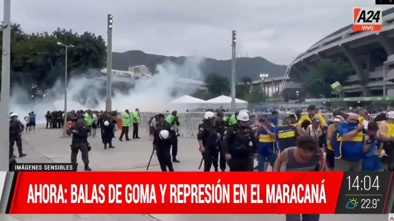 A las 17 arrancará el partido final por la Copa Libertadores entre el equipo de Boca y Fluminense. Pero en el momento que los hinchas del equipo argentino iba a entrar a la cancha en Río de Janeiro, recibieron gases lacrimógenos, balas de gomas y golpes con palos por parte de los policías del vecino país.